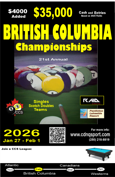 The 21st Annual CCS British Columbia 8/9 Ball Championships will be held Jan 27th to Feb 1st at the beautiful Lakeside Resort Hotel in Penticton, B.C.